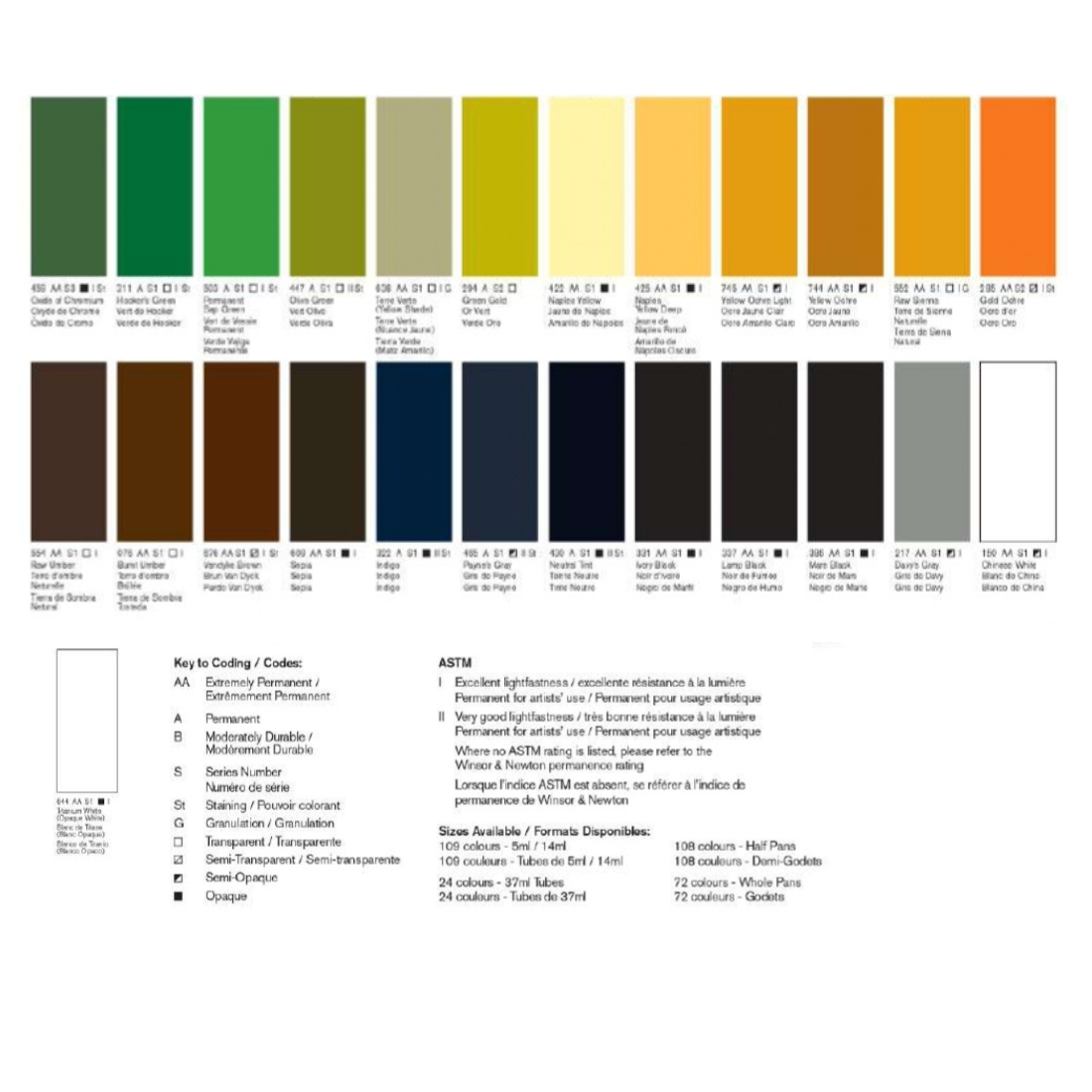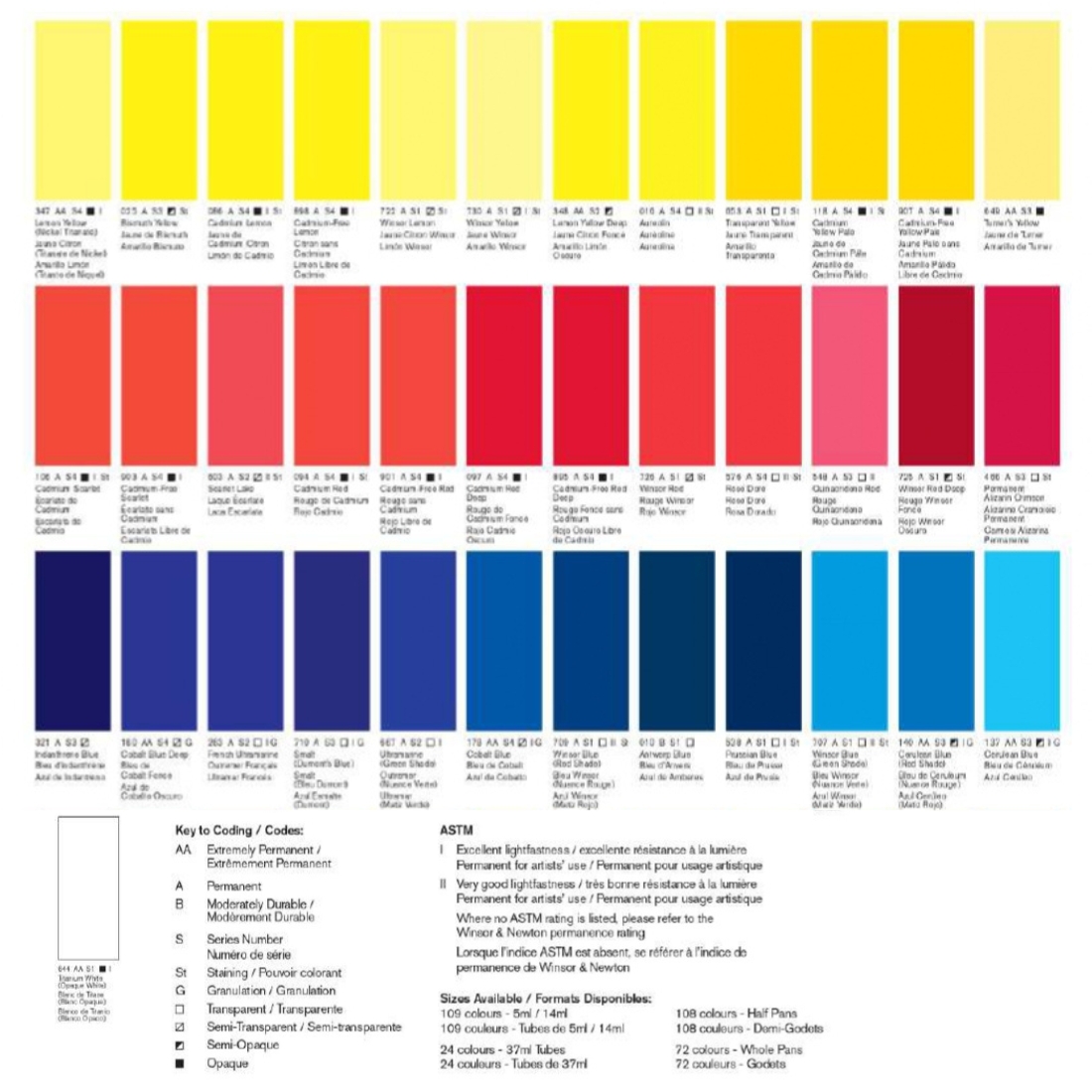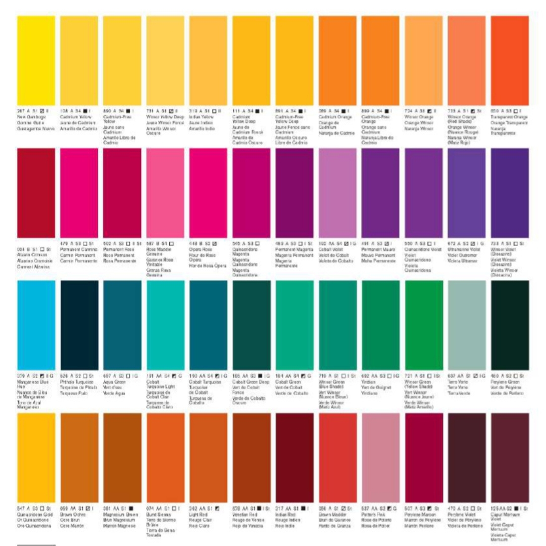 Alizarine cramoisie, Alizarine cramoisie permanent, Blanc de Chine, Blanc titane, Bleu d'Anvers, Bleu de Céruléum, Bleu de céruleum nuance rouge, Bleu de cobalt, Bleu de cobalt foncé, Bleu de Prusse, Bleu Winsor nuance rouge, Bleu Winsor nuance verte, Brun de garance, Brun magnésium, Brun van dyck, Ecarlate sans cadmium, Garance rose véritable, Jaune citron foncé, Jaune citron sans cadmium, Jaune de Bismuth, Jaune de cadmium citron, Jaune de Naples, Jaune de Naples foncé, Jaune de Turner, Jaune foncé sans cadmium, Jaune indien, Jaune pale sans cadmium, jaune sans cadmium, Jaune transparent, Jaune Winsor, Jaune Winsor foncé, Laque écarlate, Magenta permanent, Magenta quinacridone, Marron Perylène, Mauve permanent, Noir d'ivoire, Noir de fumée, Nuance de bleu de manganese, Ocre brun, Ocre d'or, Ocre jaune, Ocre jaune clair, Or quinacridone, Or vert, Orange sans cadmium, Orange transparent, Orange Winsor, Orange Winsor nuance rouge, Outremer français, Outremer nuance verte, Oxyde de chrome, Rose de poterie, Rose doré, Rouge Cadmium foncé, Rouge clair, Rouge de cadmium, Rouge de venise, Rouge indien, Rouge quinacridone, Rouge sans cadmium, Rouge Winsor, Rouge Winsor foncé, Sépia, Smalt bleu Dumont, Teinte neutre, Terre d'ombre brulée, Terre d'ombre naturelle, Terre de sienne brulée, Terre de sienne naturelle, Terre verte, Terre verte nuance jaune, Turquoise de phthalo, Vert de cobalt, Vert de cobalt foncé, Vert de Guignet, Vert de Hooker, Vert de Perylène, Vert doré, Vert olive, Vert Winsor nuance bleue, Vert Winsor nuance jaune, Violet caput mortum, Violet de cobalt, Violet outremer, Violet Perylène, Violet quinacridone, Violet Winsor Dioxazine