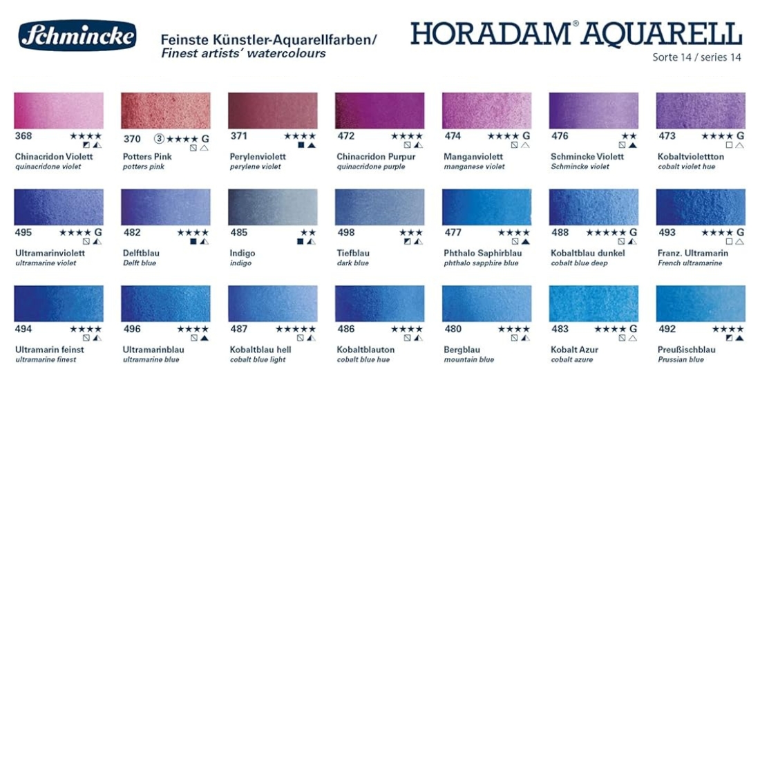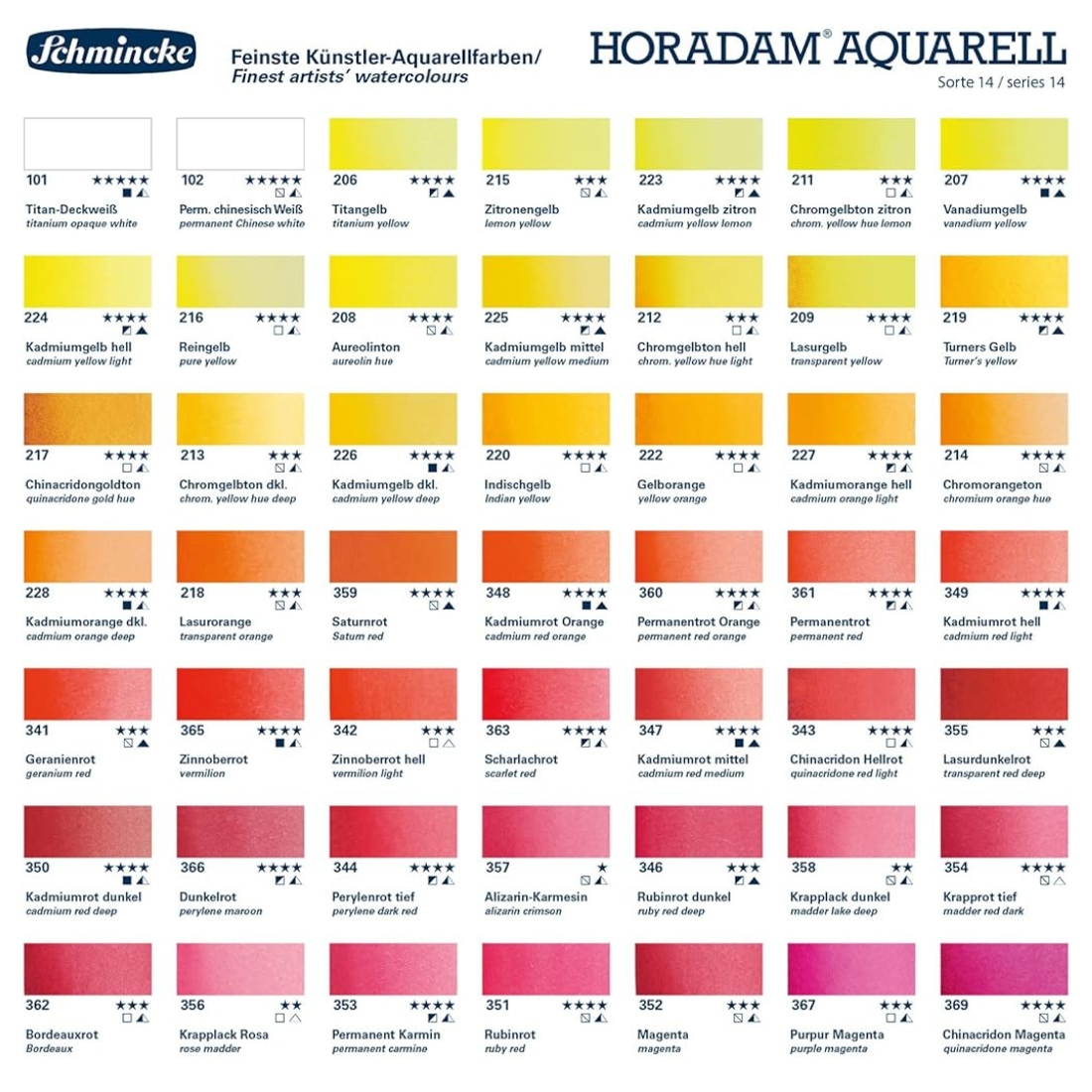 Le nuancier des demi godets Horadam de Schmincke innove en apportant des nuances de couleurs originales et différentes des autres gammes de peintures aquarelle.