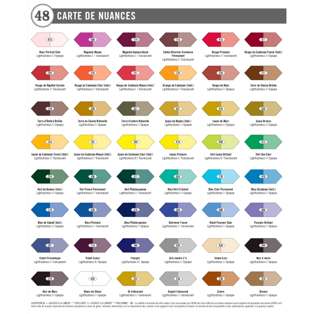 Alizarine cramoisie permanent, Argent, Blanc iridescent, Blanc titane, Blanc transparent pour mélanges, Bleu clair permanent, Bleu cobalt imitation, Bleu de ceruleum imitation, Bleu de prusse imitation, Bleu éclatant, Bleu fluo, Bleu outremer, Bleu phtalo, Bleu primaire, Bleu turquoise, Bronze, Cuivre, Graphite iridescent, Gris bleu, Gris neutre, Gris payne, Gris pourpre, Gris vert, Jaune bronze, Jaune de cadmium clair, Jaune de cadmium foncé, Jaune de cadmium moyen, Jaune de Naples imitation, Jaune fluo, Jaune oxyde, Jaune primaire, Jaune transparent, Magenta moyen, Magenta quinacridone, Naphtol carmin, Noir d'ivoire, Noir de mars, Or, Orange de cadmium imitation, Orange fluo, Parchemin, Pourpre Dioxazine, Pourpre éclatant, Rose, Rose clair, Rose fluo, Rouge cadmium clair, Rouge Cadmium foncé, Rouge cadmium moyen, Rouge fluo, Rouge orange vif, Rouge oxyde, Rouge primaire, Rouge Pyrrole, Rouge transparent, Terre d'ombre brulée, Terre d'ombre naturelle, Terre de sienne brulée, Terre de sienne naturelle, Titane écru, Vert citron, Vert clair permanent, Vert d'eau éclatant, Vert de hooker permanent imitation, Vert fluo, Vert foncé permanent, Vert jaune éclatant, Vert olive clair, Vert phtalo, Violet bleu clair, Violet foncé, Violet prismatique