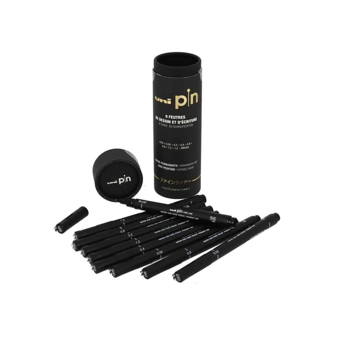 Ce set complet comprend 9 feutres calibrés Uni Pin : 0,05 mm – 0,1 mm – 0,2 mm – 0,3 mm – 0,4 mm – 0,5 mm – 0,8 mm – une pointe biseautée 2 mm – et une pointe brush souple. Tous sont dotés de l’encre permanente “Super Ink”, d’un noir profond, résistante à l’eau, à la lumière et aux UV.