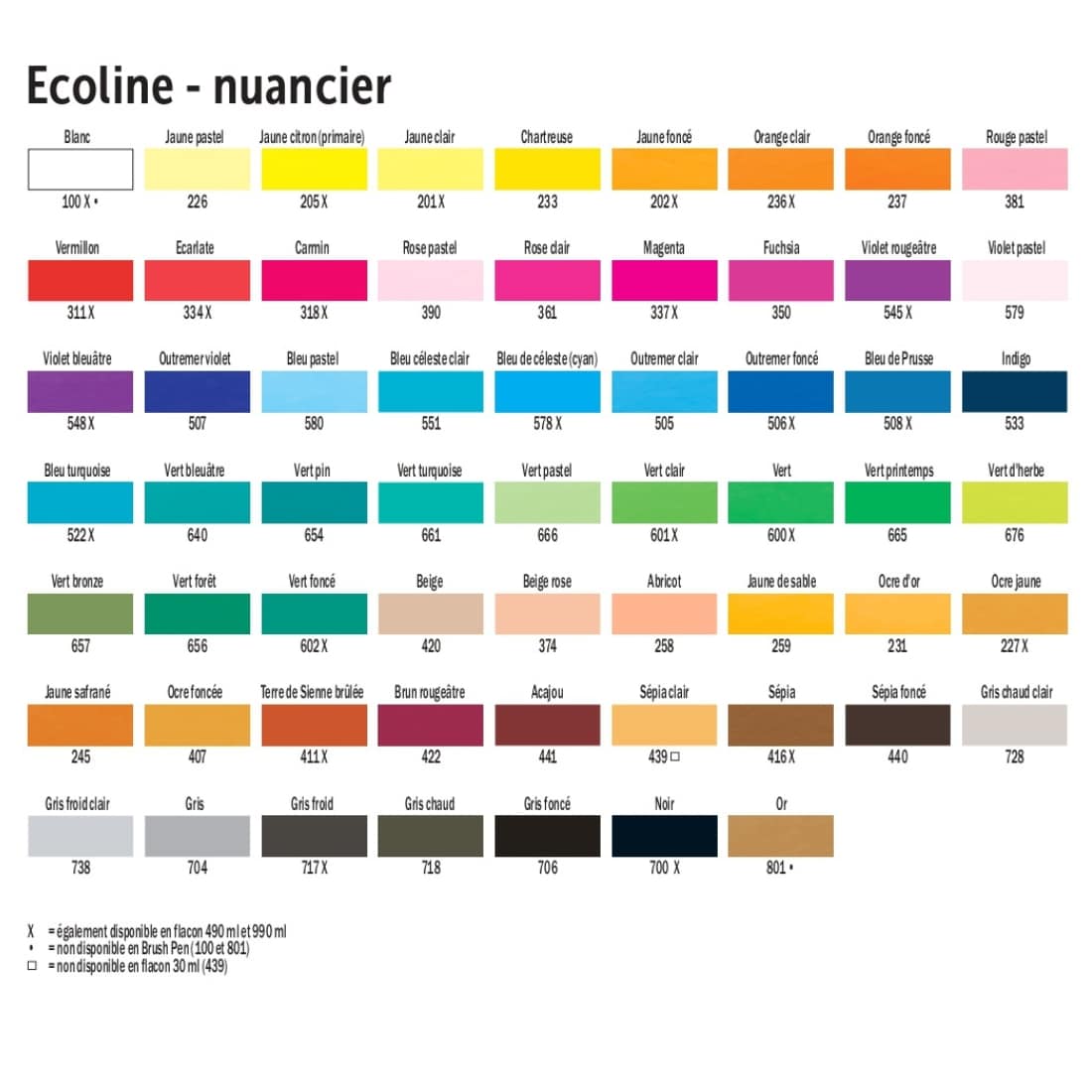 Ces encres sont polyvalentes et peuvent être utilisées pour divers projets artistiques, tels que l’aquarelle, l’illustration, le design graphique, le lettrage et la calligraphie. Grâce à leur fluidité et à leur transparence, elles permettent des applications en couches légères, idéales pour des techniques de superposition. Les encres Ecoline peuvent être appliquées avec des pinceaux, des stylos ou directement avec la pipette pour des effets plus précis. Elles sont également miscibles entre elles, offrant une infinité de possibilités de mélanges et de nuances.