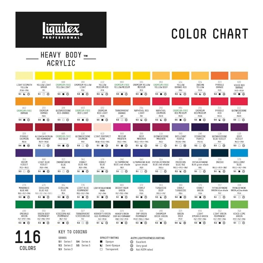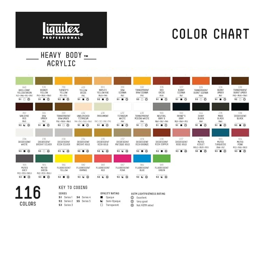 - l’acrylique heavy body de chez Liquitex est une acrylique haut de gamme, du fait de sa concentration pigmentaire, mais également du fait de son liant souple, onctueux de très bonne tenu. Pour être certain d’avoir les bons outils pour la conception d’œuvres remarquables.
