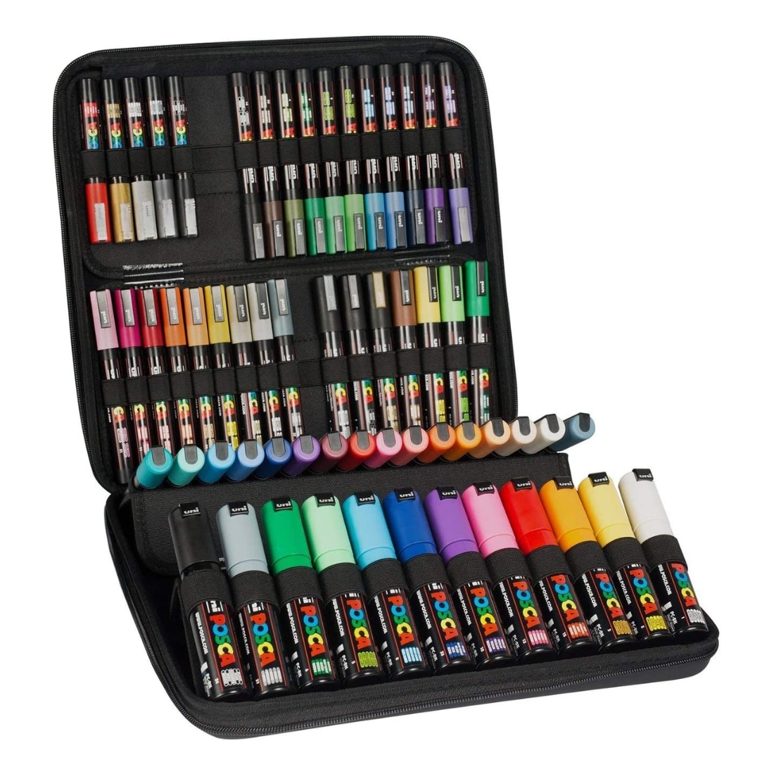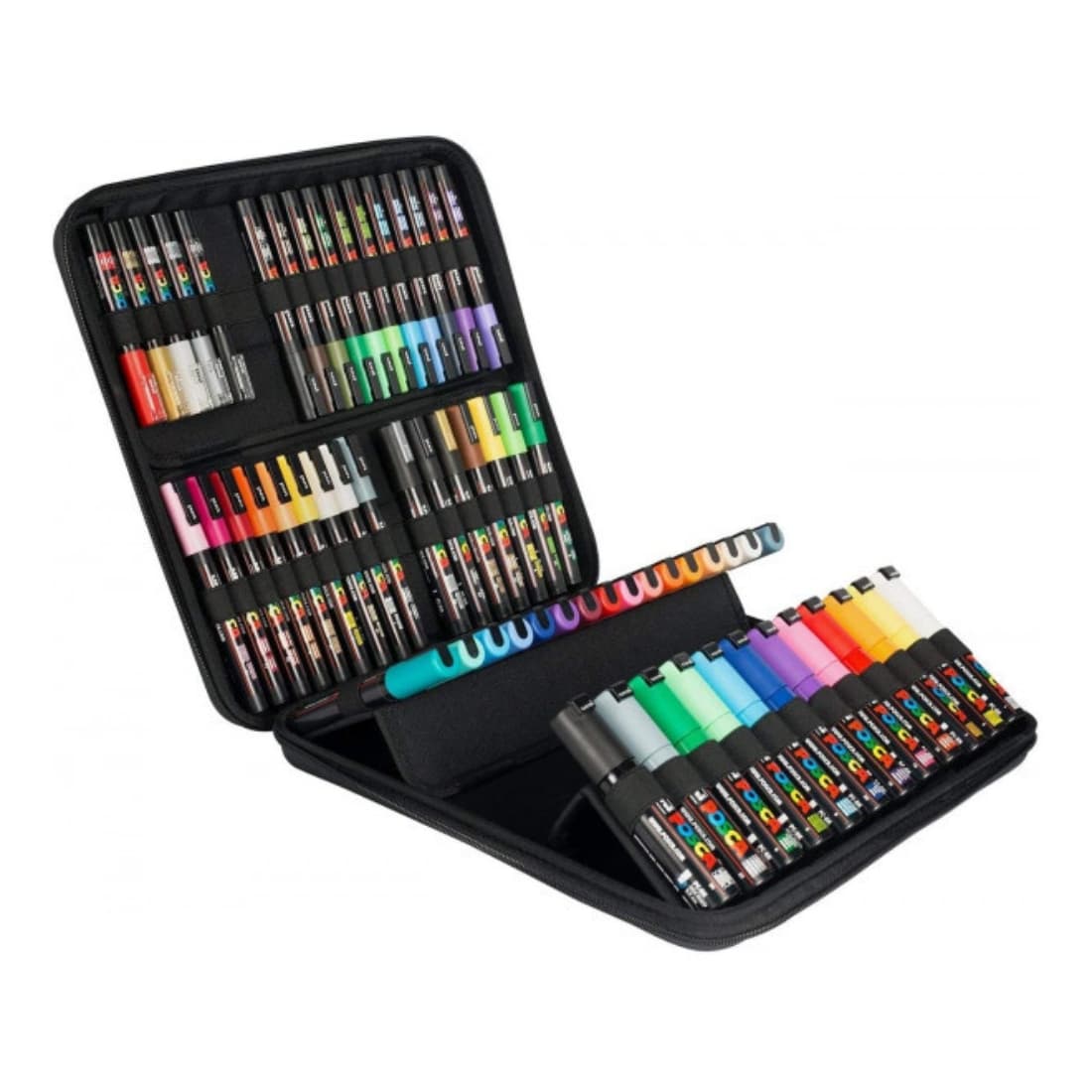 La mallette comprend un assortiment équilibré de quatre types de pointes POSCA : extra-fine (PC1MC), fine (PC3M), moyenne (PC5M) et large biseautée (PC8K), idéales pour s’initier à une variété de techniques artistiques. Vous y trouverez une sélection de 60 couleurs couvrant toutes les teintes essentielles : pastels, tons vifs, métalliques et neutres, pour répondre à tous vos besoins créatifs.