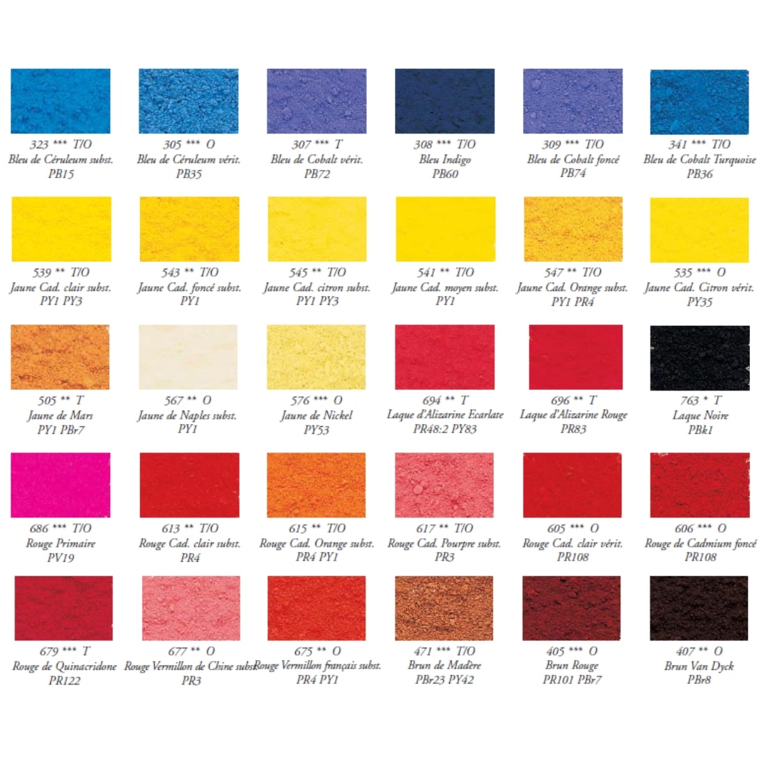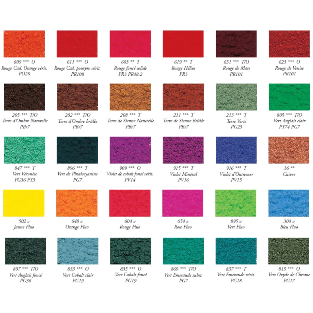 La gamme comprend 88 nuances uniques, dont 86 sont disponibles en pots de 200 ml. Ces pigments de très grande qualité constituent la matière première essentielle pour créer vos propres couleurs. Ils peuvent être mélangés avec une variété de liants tels que la gomme arabique, l’huile, le liant acrylique ou vinylique, afin de confectionner des peintures adaptées à toutes les techniques picturales.