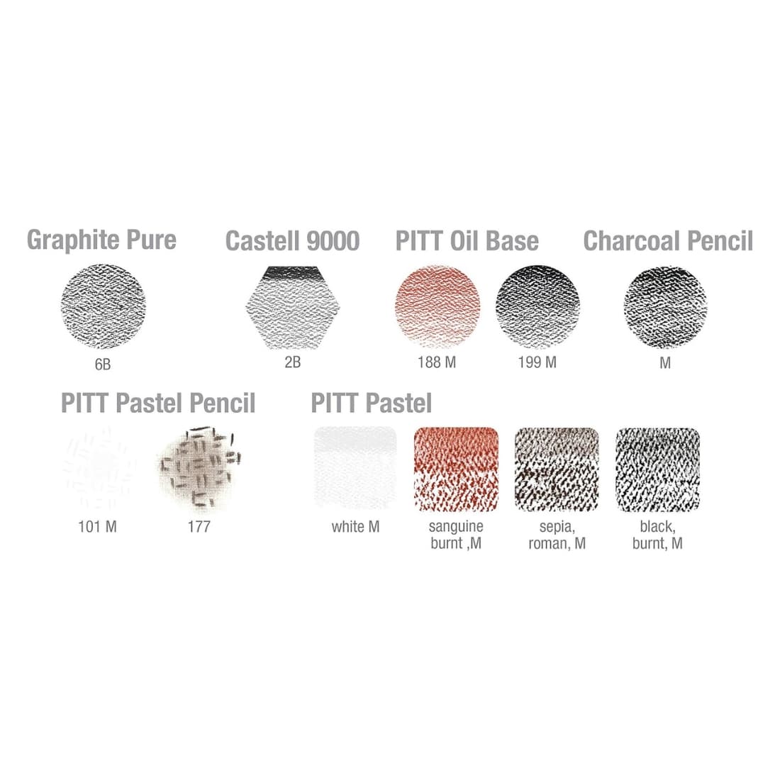 - Composition du set : 1 crayon graphite 9000(2B), 1 crayon Pitt Graphite Pure (6B), 2 crayons Pitt oil base (noir tendre et sanguine), 1 crayon fusain Pitt, 2 crayons pastel Pitt (blanc moyen, brun noix), 4 craies Pitt (blanc moyen, sanguine brûlée, sépia romaine, noir brûlé moyen et une gomme mie de pain.