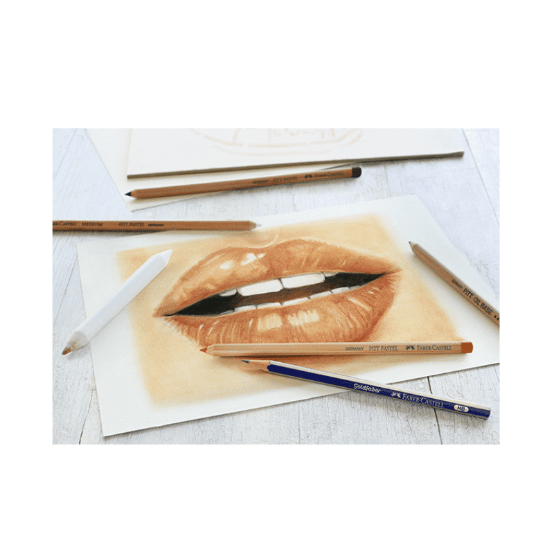 Composition du set : 1 crayon graphite Goldfaber 2B, 1 Pitt à base d’huile noir moyen, 1 crayon pastel Pitt blanc moyen, 1 crayon pastel Pitt sanguine sans huile, 1 pastel Pitt sans huile sépia clair, 1 estompe. C’est le set idéal pour apprendre à dessiner.