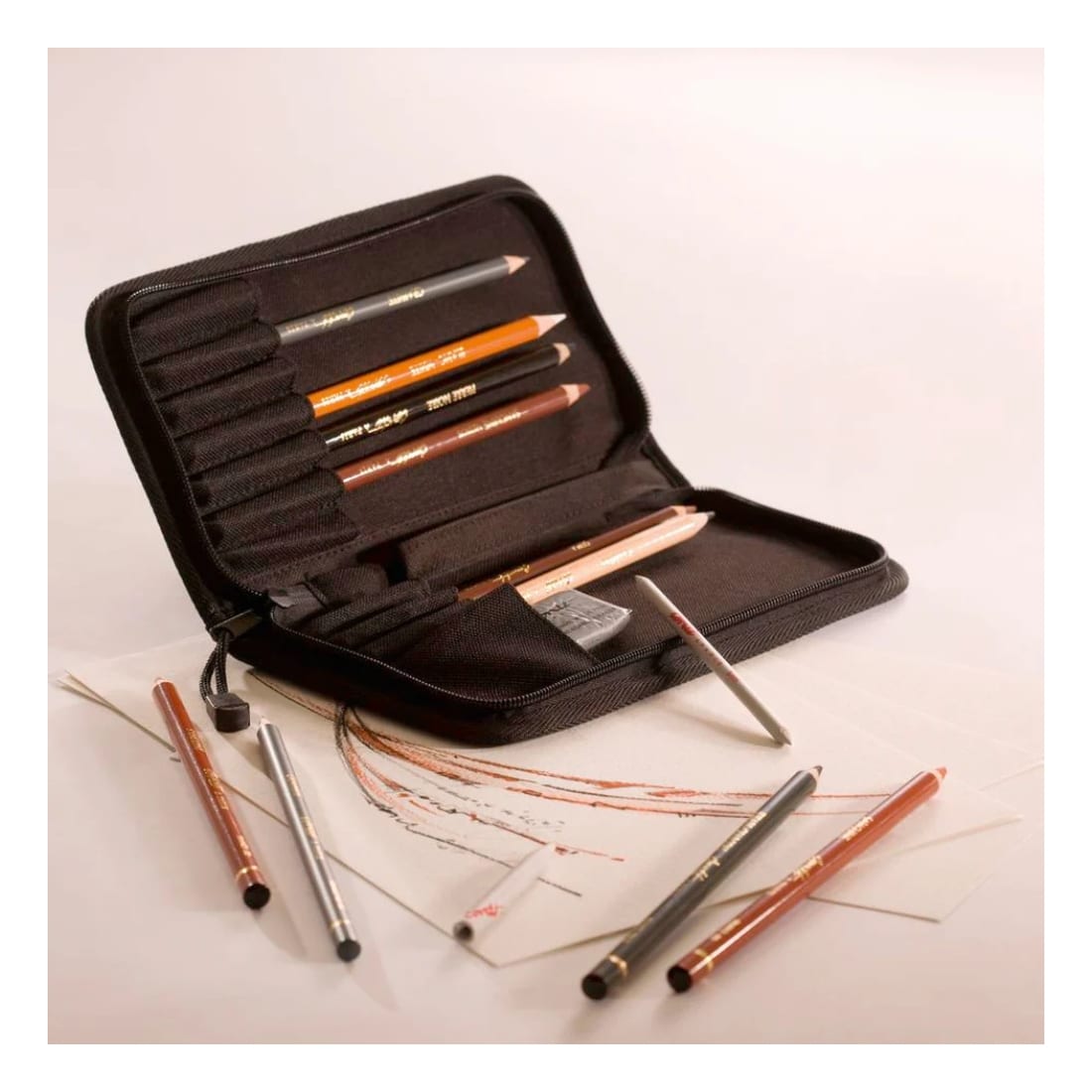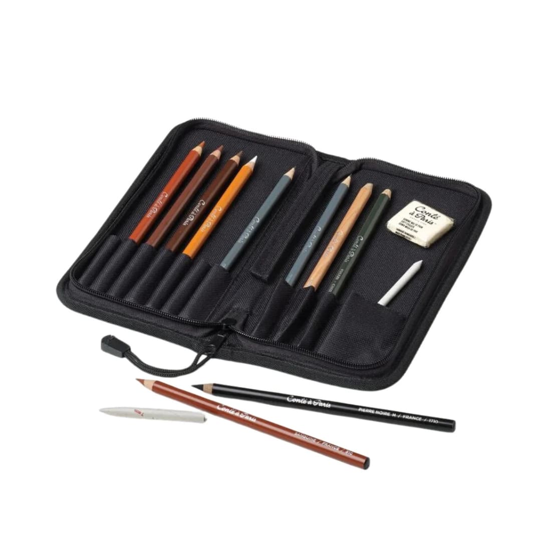 Un assortiment de crayons emblématiques (Sanguine, Sépia, Pierre Noire, Graphite, Fusain…), complété d’estompes et d’une gomme mie de pain, dans une jolie trousse pratique.